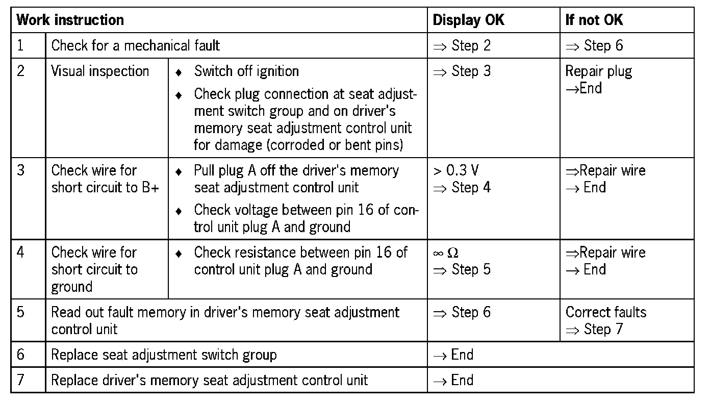 Visual inspection: In the next troubleshooting section, first check that the affected pins on the driver's memory seat adjustment control unit plug connection are not damaged or corroded. The wiring and plugs of the affected components must also be checked for external damage and correct contact. Repair damaged or corroded pins if possible, otherwise replace affected pins. Repair or replace damaged wires.