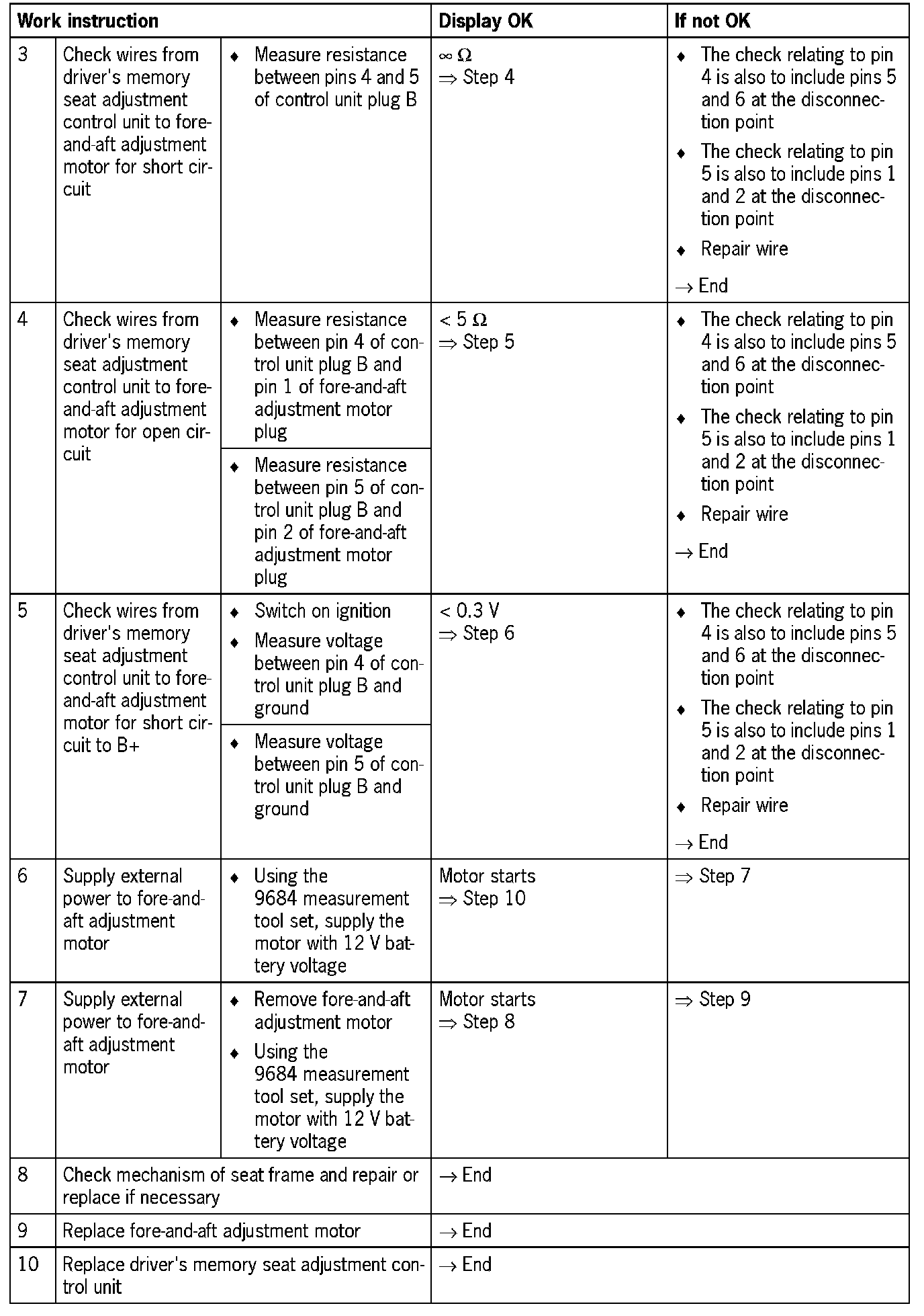 NOTE: In the wiring harness from the driver's memory seat adjustment control unit to the fore-and-aft adjustment motor, there is a disconnection point for the emergency power supply which must be included in the checks.