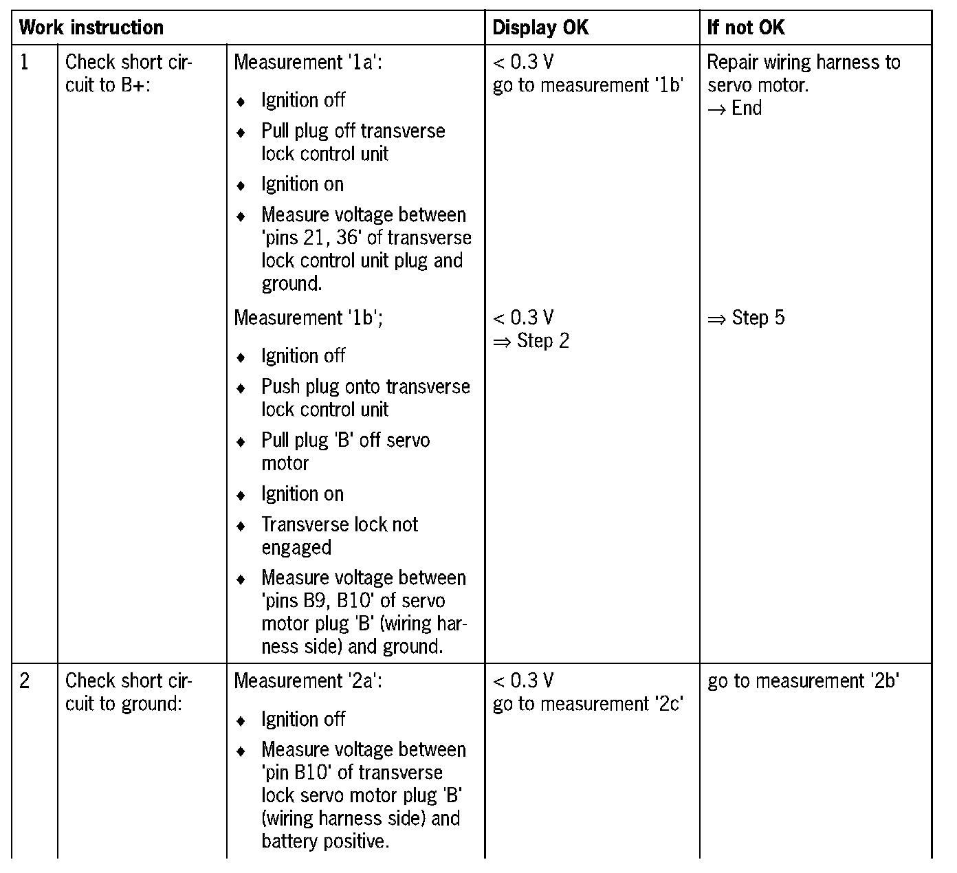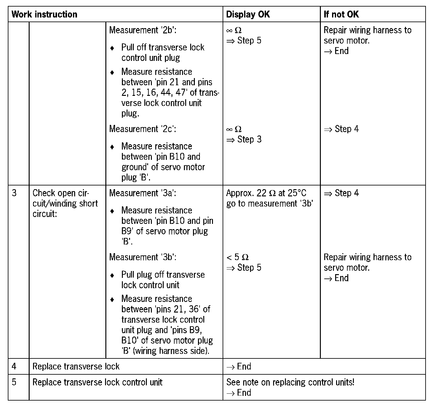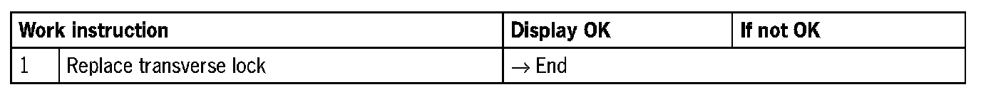 Visual inspection: In the next troubleshooting section, please check first that the affected 'pins' of the transverse lock control unit plug connection and the 'pins' of the plug connections on the servo motor are neither damaged nor corroded. Remove any soiling or corrosion/oxidation. Replace damaged parts/wires.