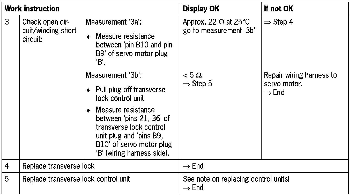 - Visual inspection: In the next troubleshooting section, please check first that the affected 'pins' of the transverse lock control unit plug connection and the 'pins' of the plug connections on the servo motor are neither damaged nor corroded. Remove any soiling or corrosion/oxidation. Replace damaged parts/wires.