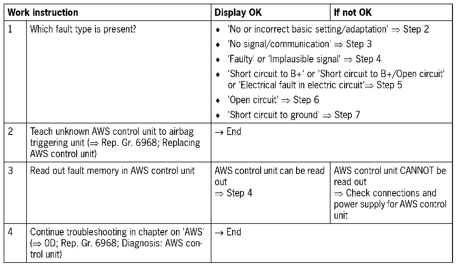- Short circuit to B+/ground or open circuit in the wiring between the AWS control unit and the airbag triggering unit