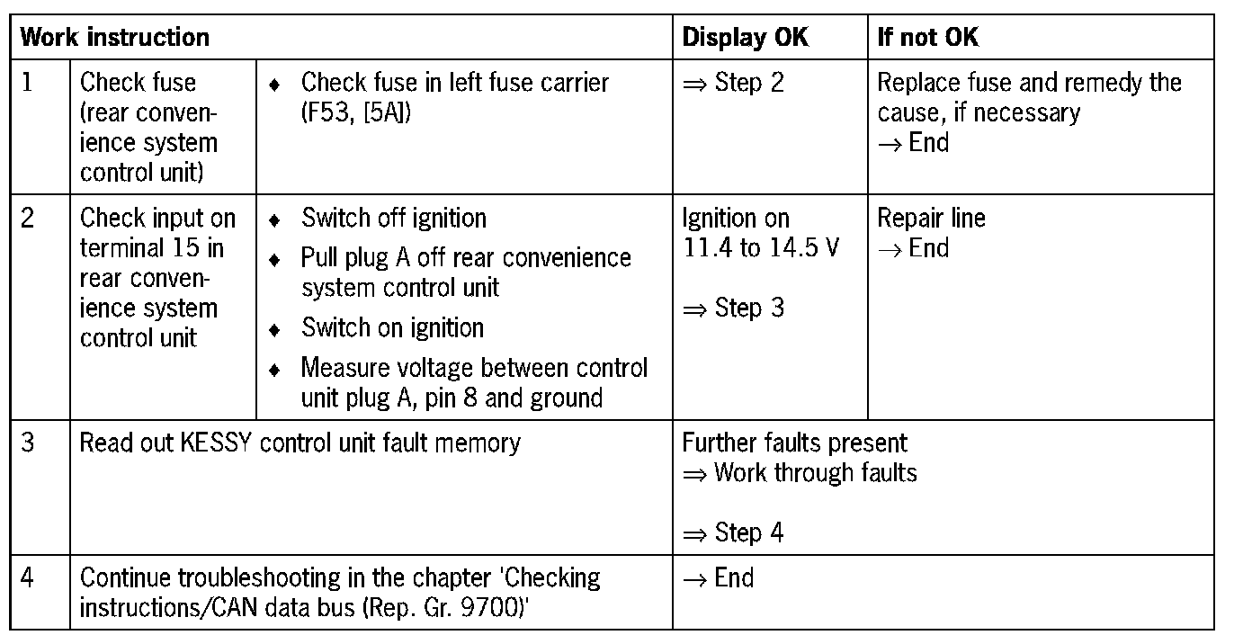 Visual inspection: In the next troubleshooting section, please check first that the affected pins on the rear convenience system control unit plug connection are neither damaged nor corroded. The wiring and plugs of the affected components must also be checked for external damage and proper contact Repair damaged or corroded pins it possible, otherwise replace affected pins. Repair or replace damaged wires.