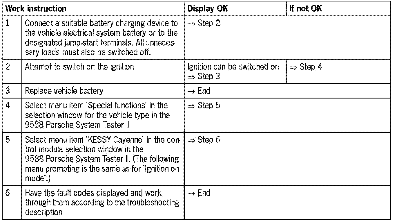 NOTE: The basic equipment of the Cayenne includes the immobiliser control module. The Porsche Entry & Drive (KESSY) function can also be integrated into the immobiliser control module. In fact, the assembly of both control modules is identical, but the Serv. Nos. are different (immobiliser control module: Serv. No. 9668 and KESSY control module: Serv. No. 9666). The diagnosis/troubleshooting provided here can be applied to both the immobiliser system and the KESSY system. The difference, from the point of view of diagnostics, is that the fault codes 0179, 0180, 0181, 0182, 0183, 0190, 0191, 0192 and 0193 cannot occur for the immobiliser control module. In addition, various menu and selection functions in the 9588 Porsche System Tester II are not used. In the component arrangement, the following components are omitted for the basic immobiliser: front left door antenna, front right door antenna, rear left door antenna, rear right door antenna, front left door sensor, front right door sensor, rear left door sensor, rear right door sensor, antennas on end of centre console, antenna on switching slot cover, loadspace antenna and the antennas on the rear bumper.