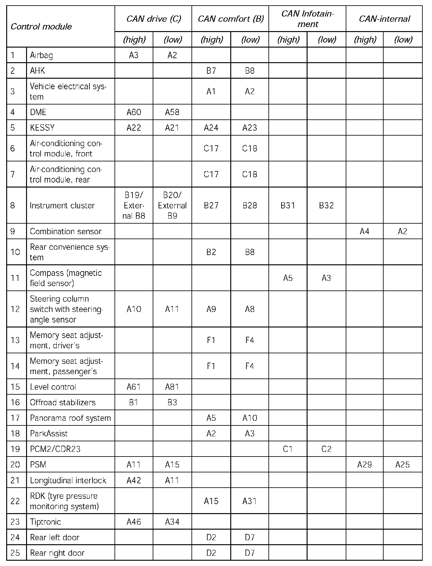 One of the following errors is memorised in all control modules: CAN drive (high/low)/ CAN infotainment (high/low)/ CAN comfort OFF (high/low)
