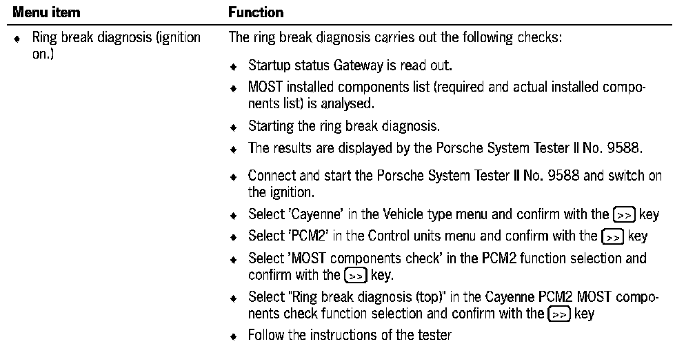 NOTE: When there is a customer complaint or identifiable problems but no fault code entries, firstly the 'MOST component check' is to be selected in the PCM2 function selection menu and then the 'MOST system check' is to be carried out.