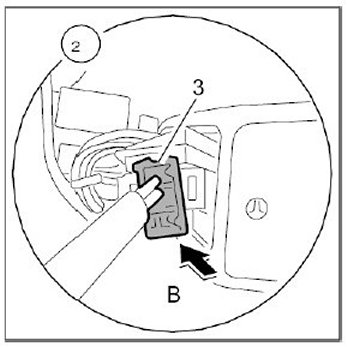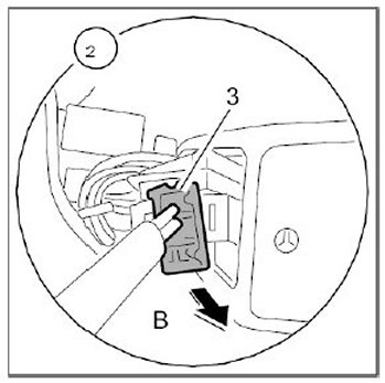 2.1. Push on the plug -3- until the locking tabs engage audibly -Arrow B-. When doing so, ensure that the plug -3- is positioned correctly in the mount -4- for the front ashtray -1-.