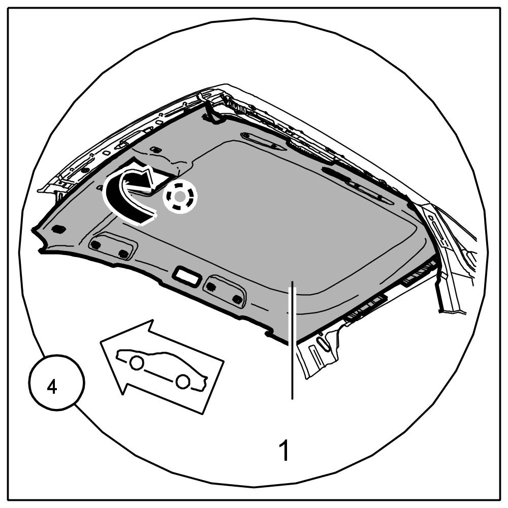 1. Unclip headliner -1- from fastening clips -14- close to sunroof cut-out.