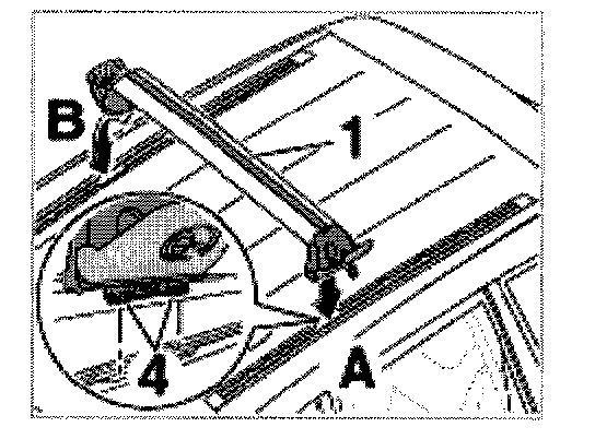 b. Fasten the carrier -1- on one end and position it slanted over the vehicle roof.