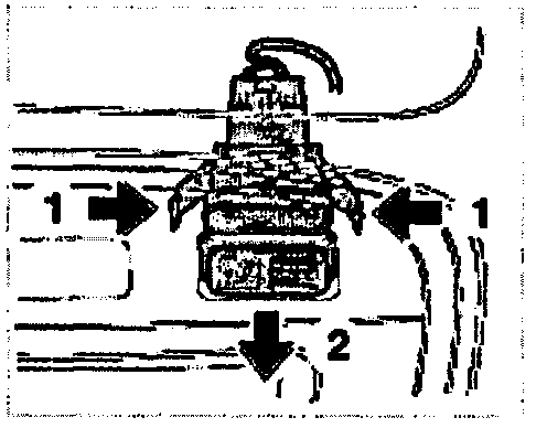 1. Press together the two safety brackets -1- and pull out the connector -2- towards the front.