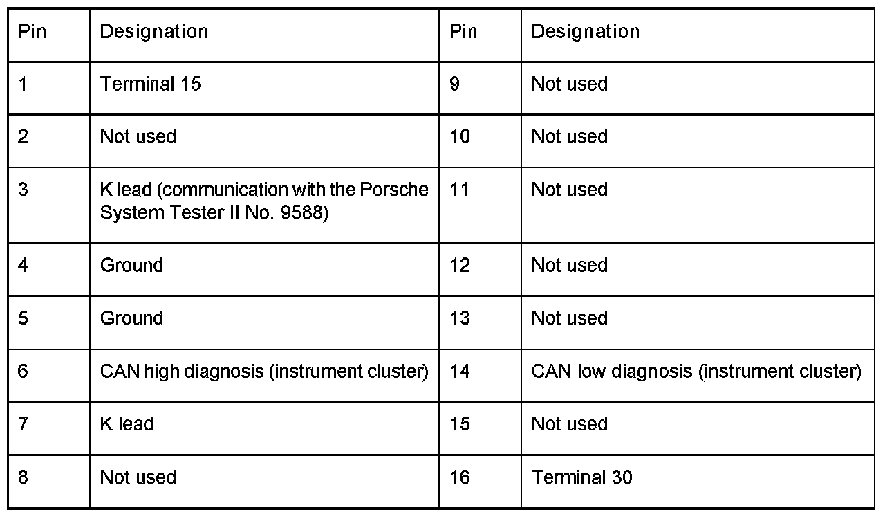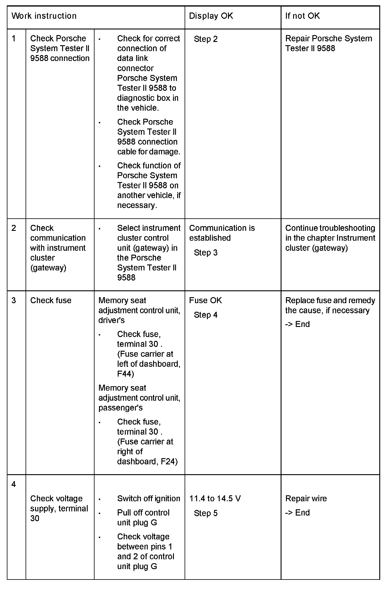 NOTE: The driver's memory seat adjustment control unit is not connected directly to the diagnostic socket (16-pin, driver's footwell). Communication between the driver's memory seat adjustment control unit and the Porsche System Tester II 9588 only takes place indirectly via CAN comfort Gateway K' lead.