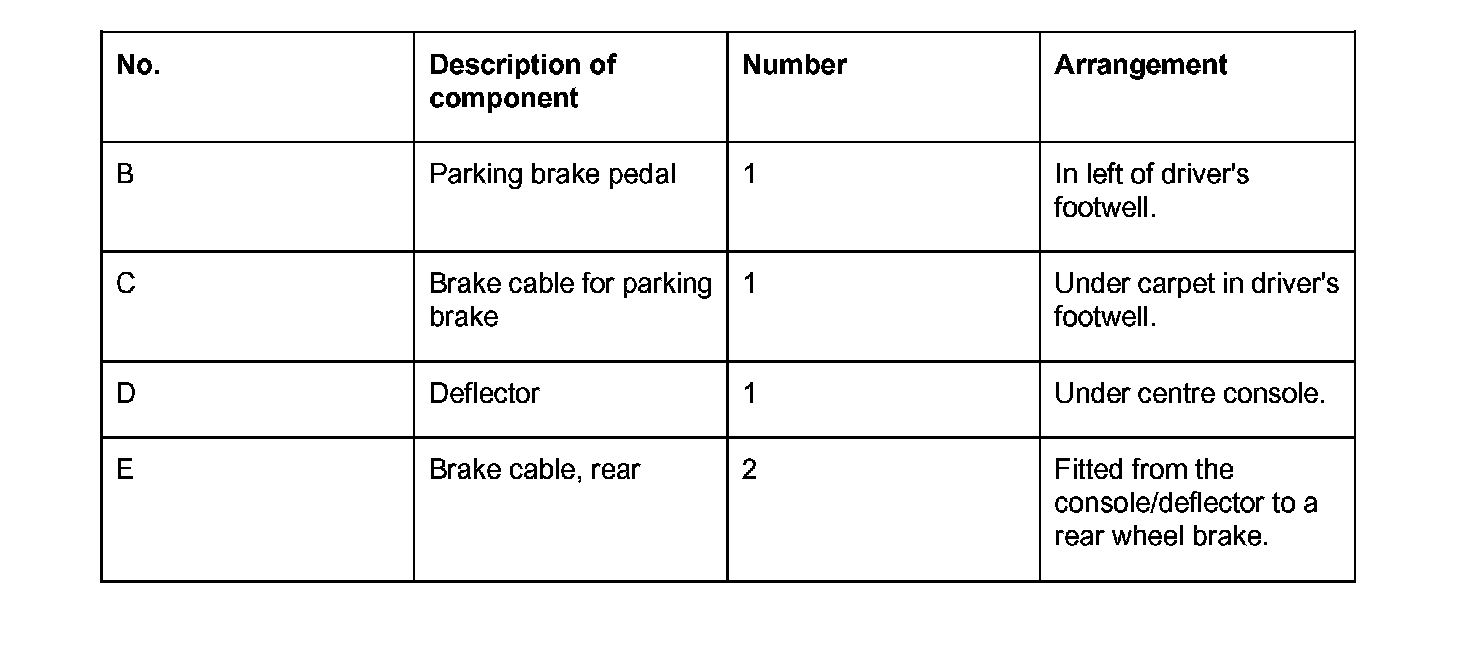 A cable is routed from the foot-operated lever to a deflection lever under the centre console, which transmits traction to a turnbuckle with a transmission ration of 3.1. Two cables are routed from the turnbuckle to the parking brake on the rear axle.