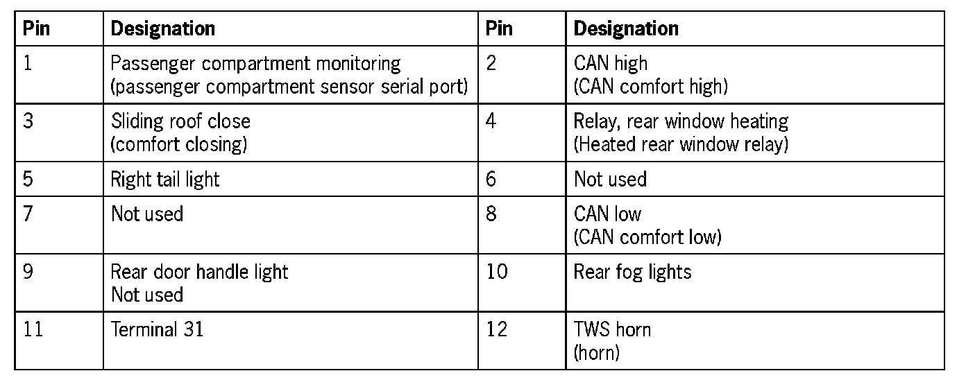 Connector assignment, rear convenience system control unitRear convenience system control unit