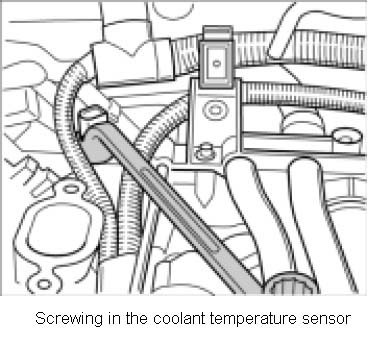1. Clean sealing surfaces and screw in coolant temperature sensor with a new sealing ring into the distributor pipe. Tightening torque: 22 ft-lb.