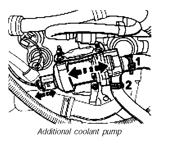 4. Disconnect cable plug of the additional coolant pump. Pull out additional coolant pump laterally from the rubber mountings. Pull off spring band clamps -1 and 2- of the coolant hoses.