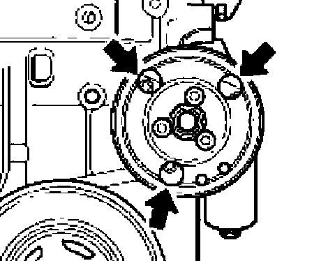 3. Turn the drive wheel for the coolant pump in such a way that the fastening screws can be reached through the holes in the belt pulley -arrows-.