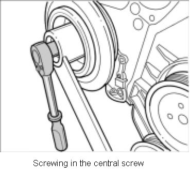 1. Block the crankshaft belt pulley using an arm bracket and undo the central screw (a/f 27). Do not use the screw again.