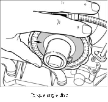 3. Block the crankshaft belt pulley using an arm bracket and tighten the central screw (a/f 27) to the specified tightening torque. For torque-angle screws, use the torque angle torque key NR.88 (or a mechanical angle disc for torque-angle threaded joints NR.88-1). Attach the magnetic foot to a metal part and set the scale by turning the pointer to 0. Initial tightening: 74 ft-lb. Final tightening: 90°