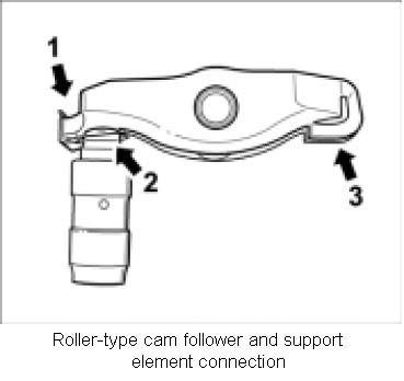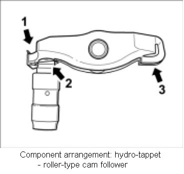 2. Check component arrangement. Check that the components are complete and intact. Replace any faulty or damaged components. The safety clip is hooked into the front of the roller-type cam follower -1- and support lever -2-. Observe the position of the valve pressure face with respect to the roller-type cam follower during removal -3-.