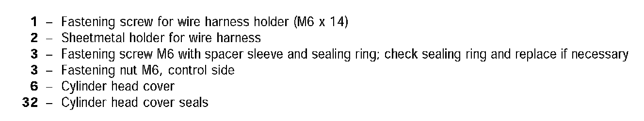 2. Position cylinder head cover on the cylinder head and fit all 9 fastening screws and 2 fastening nuts on the cylinder head cover. Tighten all fastening elements uniformly in clockwise direction. Tightening torque: 10 (7.5 ft-lb.) Nm