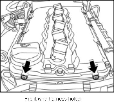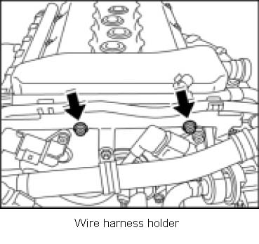 4. Position 2 Torx screws on the front of the cylinder head cover -arrows- and tighten the holder for the wire harness. Tightening torque: 10 (7.5 ft-lb.) Nm