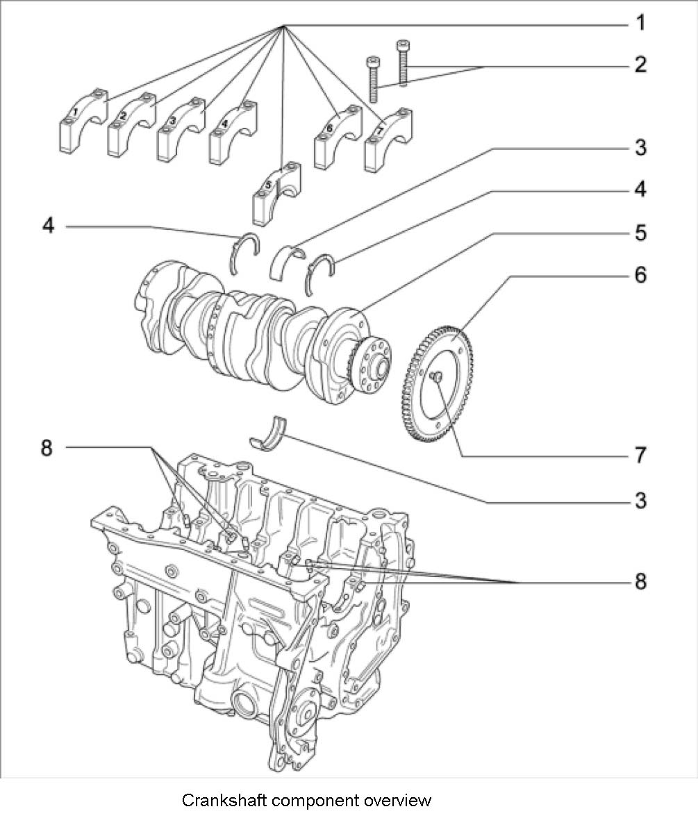 ^ Bearing covers for the crankshaft are numbered 1 to 7 and the numbers can be read on the side facing the exhaust.