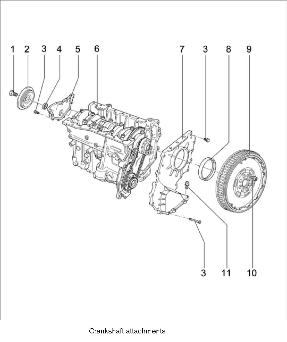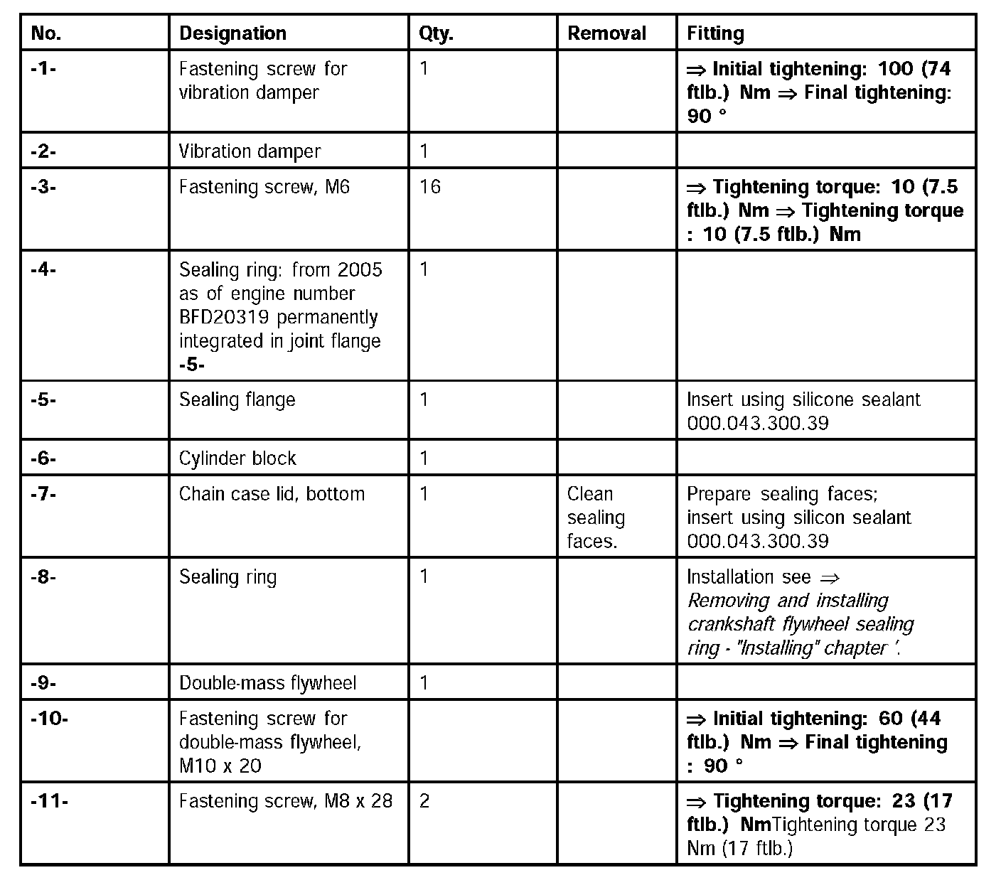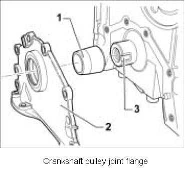 Note: The crankshaft sealing ring for the pulley was changed in model year 2005 as of engine number BFD20319. This crankshaft sealing ring is now permanently integrated in the joint flange and can no longer be changed as a separate item. If there is a leak, the complete joint flange must be replaced.