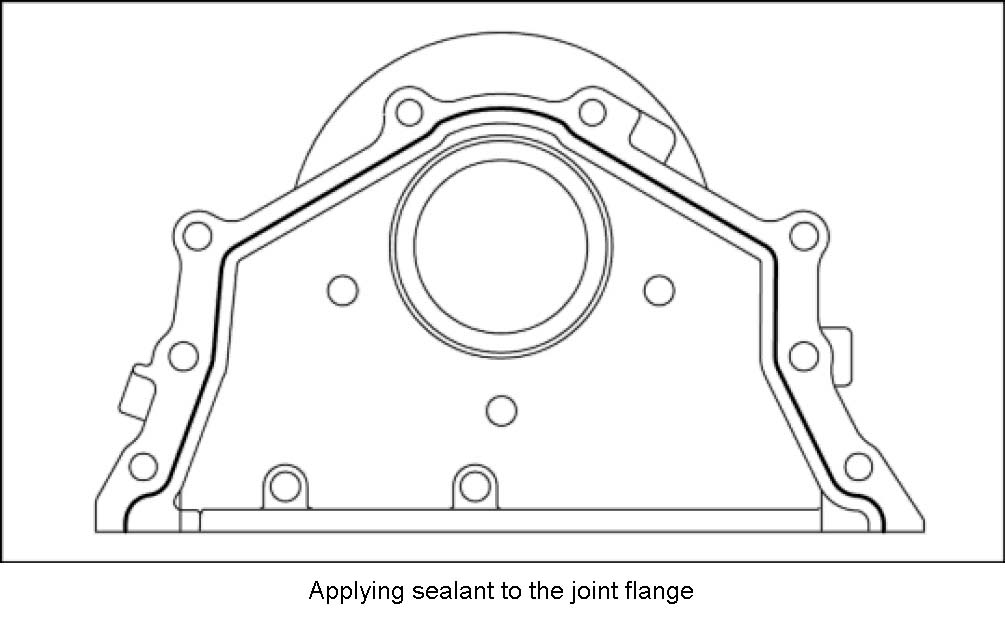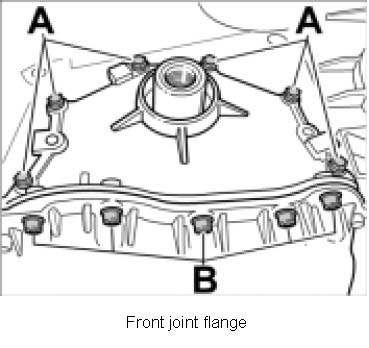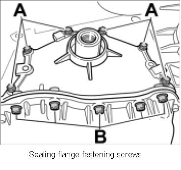 7. Install joint flange at the front behind the pulley. To do this clean sealing faces. Apply silicon sealant 000.040.300.39 thinly and evenly on the sealing faces of the joint flange. Mount joint flange immediately and fit fastening screws. Tighten fastening screws evenly. Tightening torque: 10 (7.5 ft-lb.) Nm