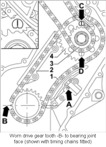 6. Check whether the gap in the teeth of the speed sensor wheel points downwards in the top dead center position -arrow-. At the same time, the ground tooth of the crankshaft sprocket must align with the joint face of the bearing cover -B-.