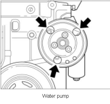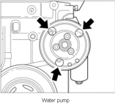 7. Remove water pump. To do this, remove three internal-serration screws through the pulley from the front and remove the water pump. Collect emerging coolant. Replace sealing ring.