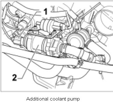 8. Remove coolant run-on pump at top chain case lid -2-. To do this, pull off cable plug and remove together with coolant hoses. Press pump out of the bracket at the rubber mounts.