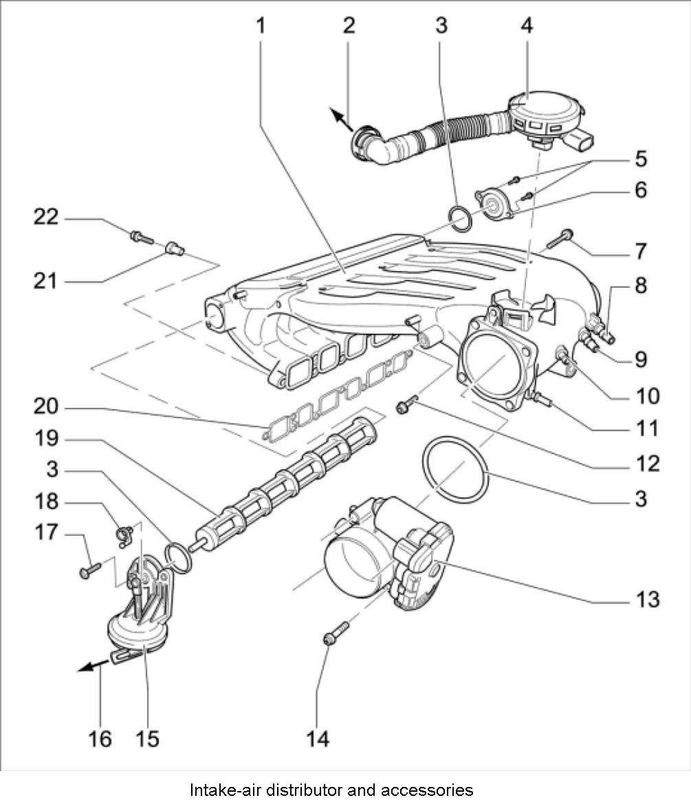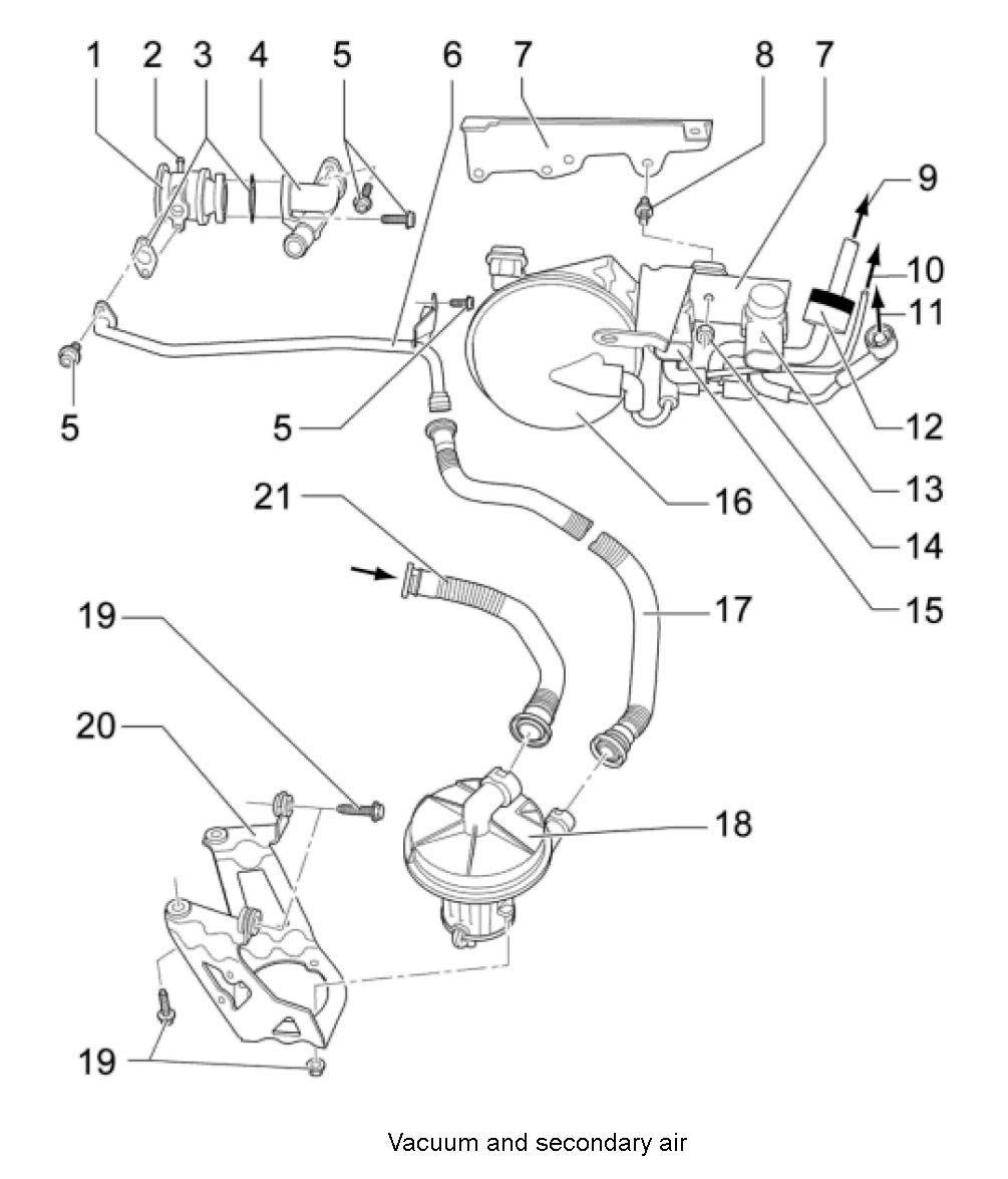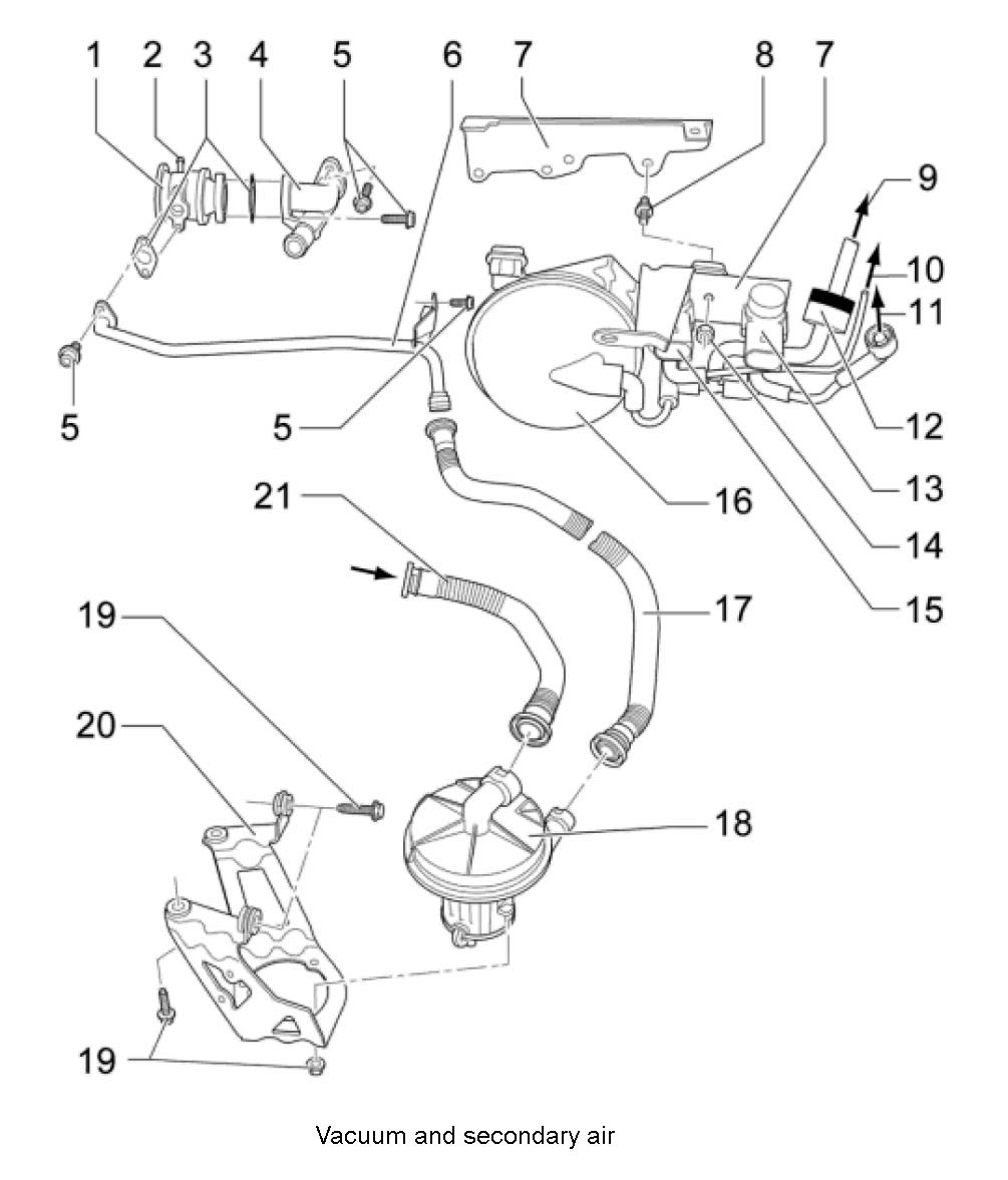 13. Unscrew the secondary air valve (combination valve) -1 to 5-. To do this, unscrew three M6 x 23 fastening screws. Replace seal.