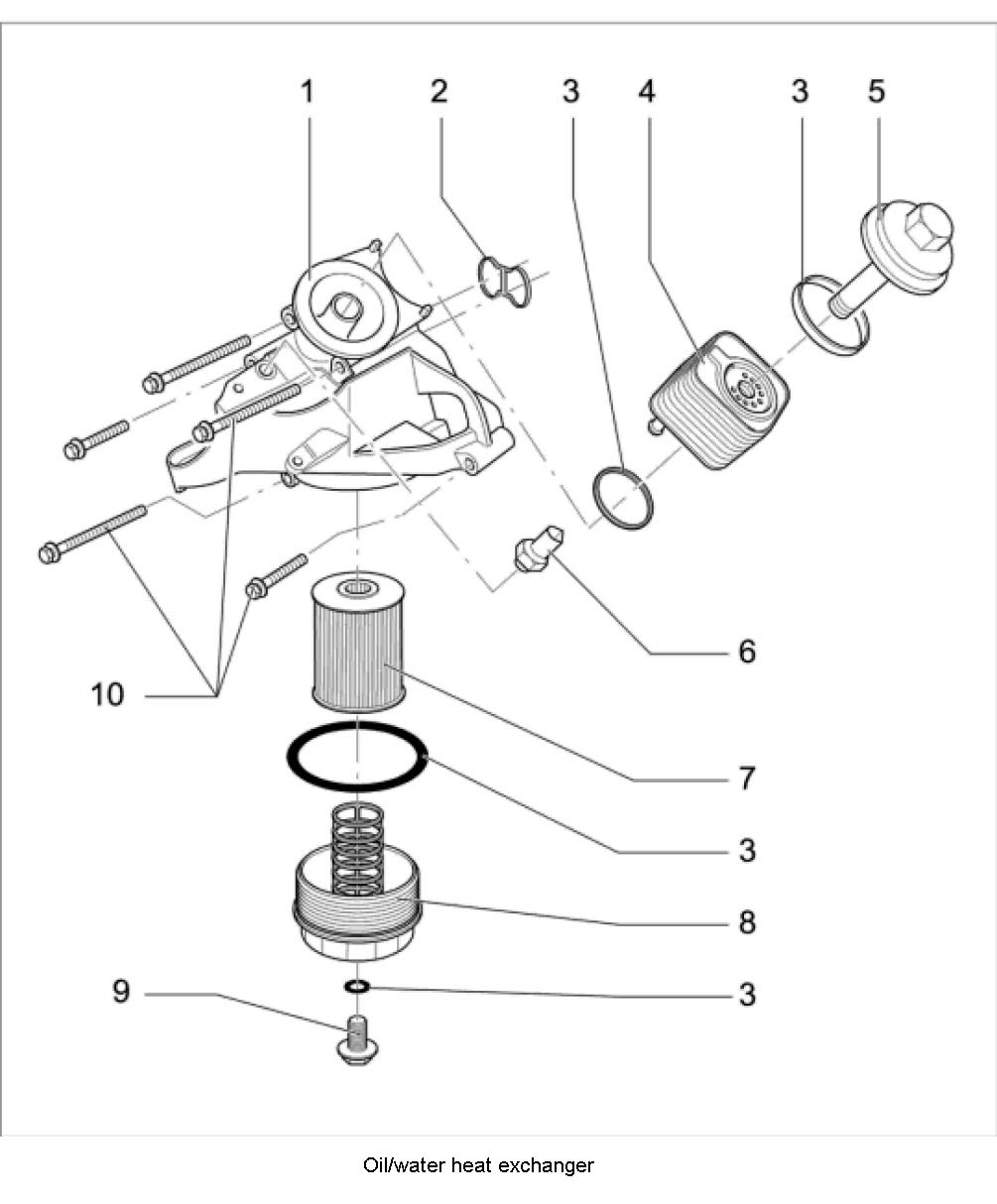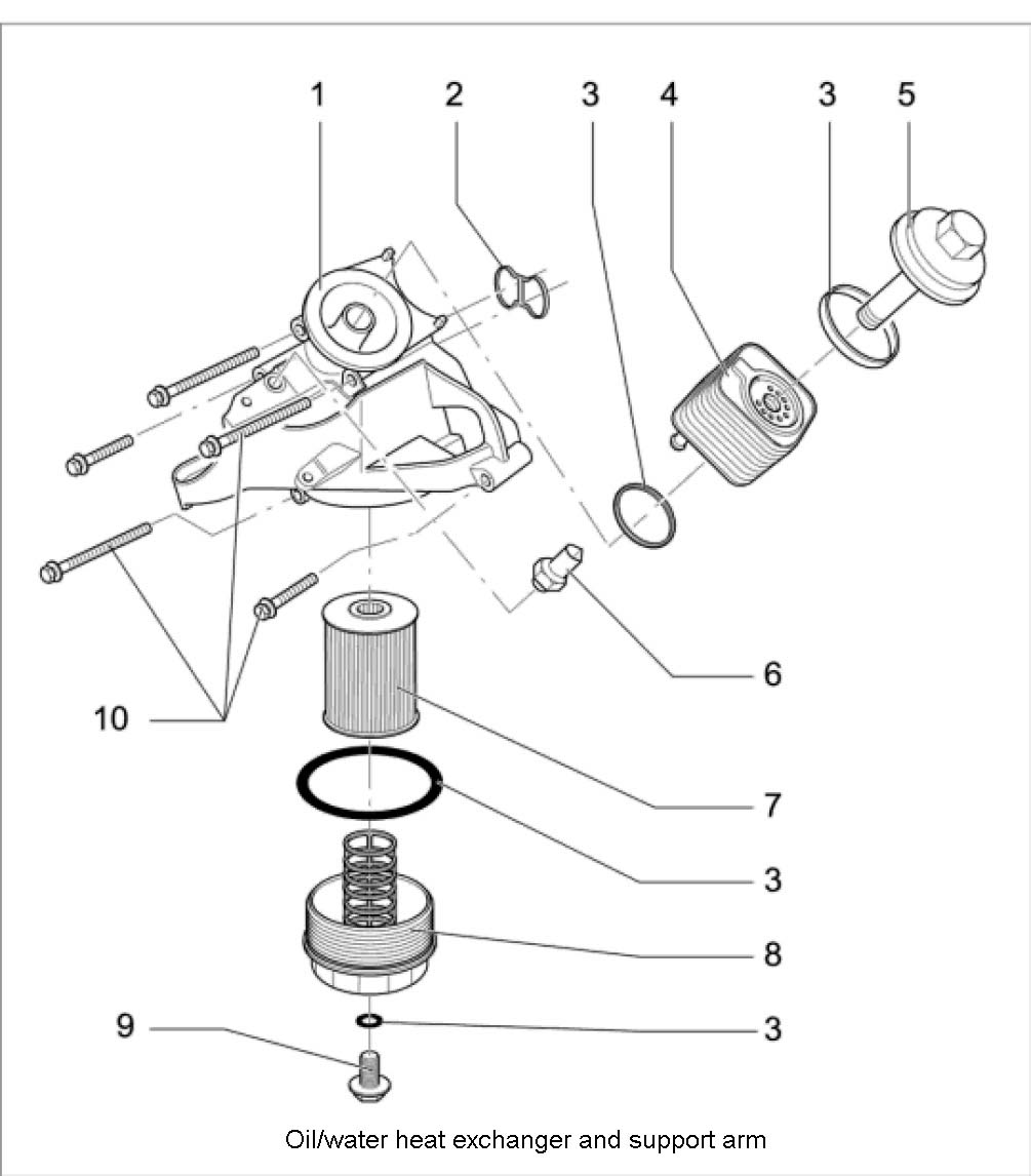 33. Fit oil/water heat exchanger -3 to 5-. Fit oil filter housing/engine support arm -10-. Replace seals -2 and 3-. Tightening torque: 23 (17 ft-lb.) Nm