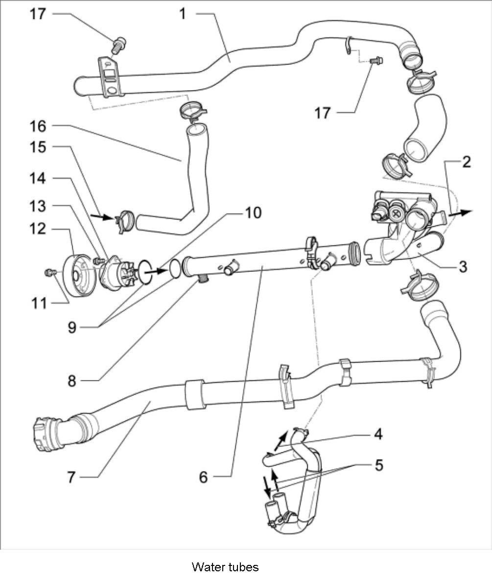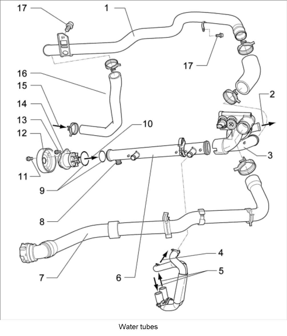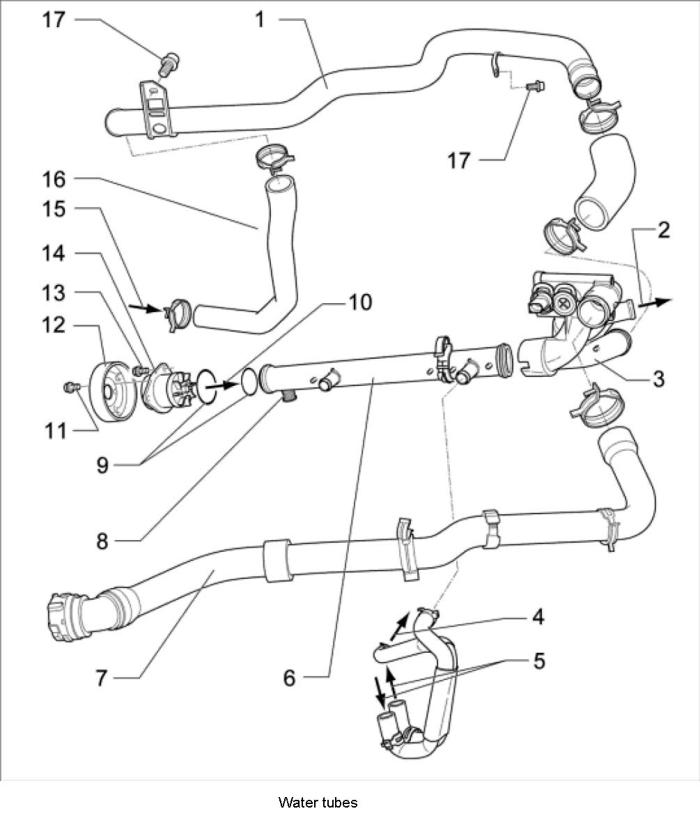 16. Remove aluminum water tube -1- under the exhaust manifolds. To do this, unscrew two fastening screws -17- from the holders and pull the spring band clamp and water hose off the flange.