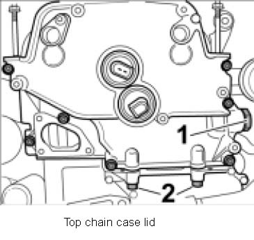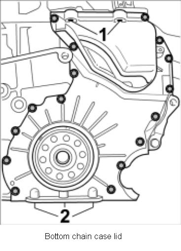26. Unscrew both chain case lids (top and bottom). Hall senders can remain fitted on the top chain case lid. Top chain case lid Bottom chain case lid