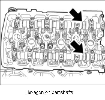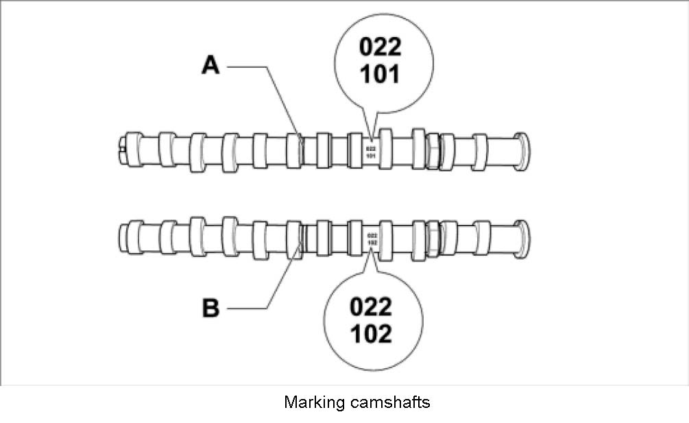 Note: Grooves and numbers are located in the middle of the camshafts: No. 102 inlet, two grooves -B-, No. 101outlet, one groove -A-!