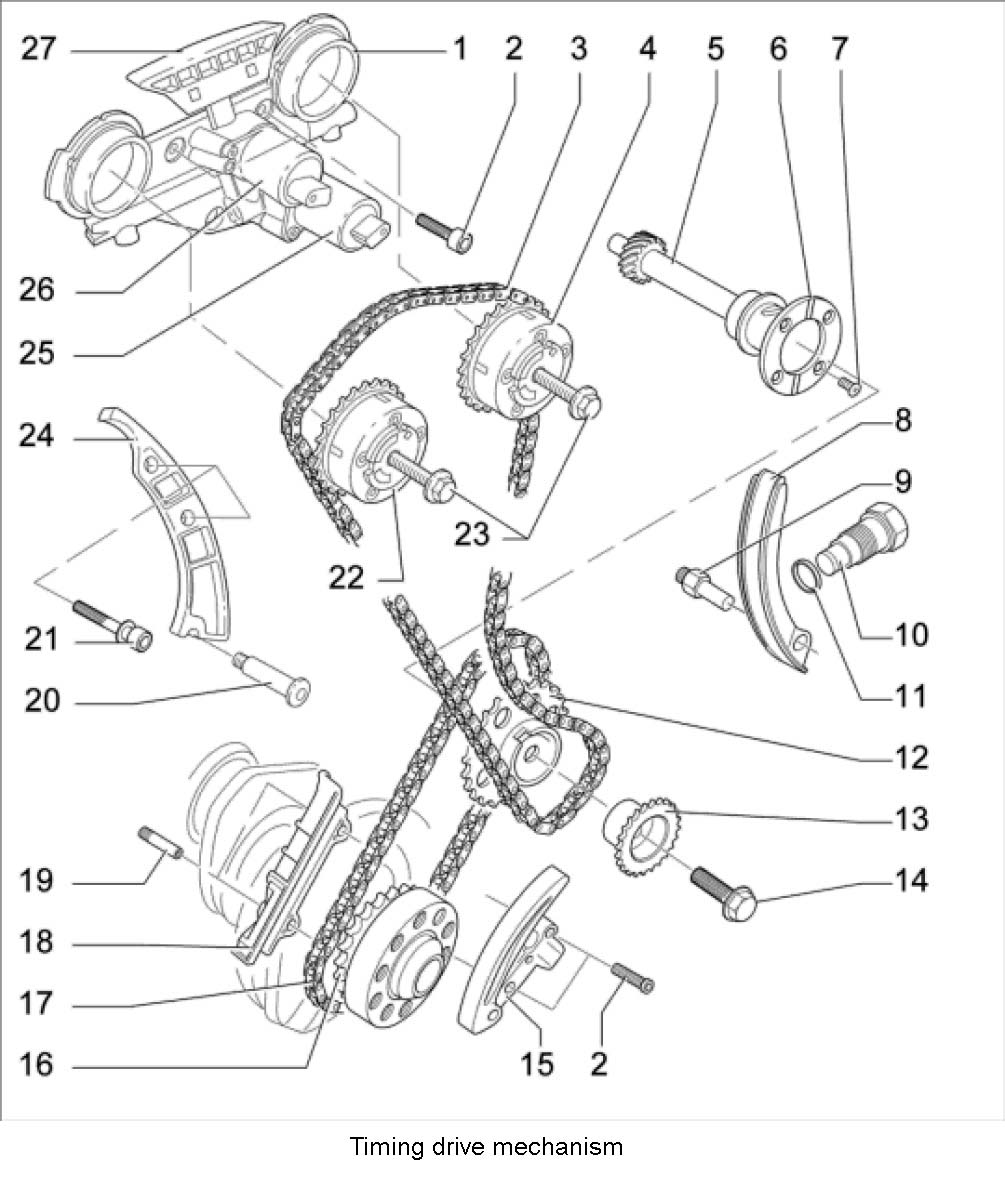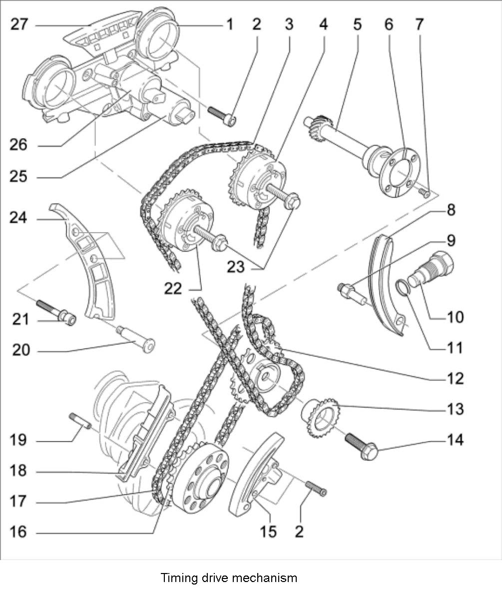 33. Loosen bottom chain tensioner -15-. Hold the chain tensioner in tensioned state and secure with a tie-wrap. Loosen two fastening screws -2 below- and remove tensioned chain tensioner.