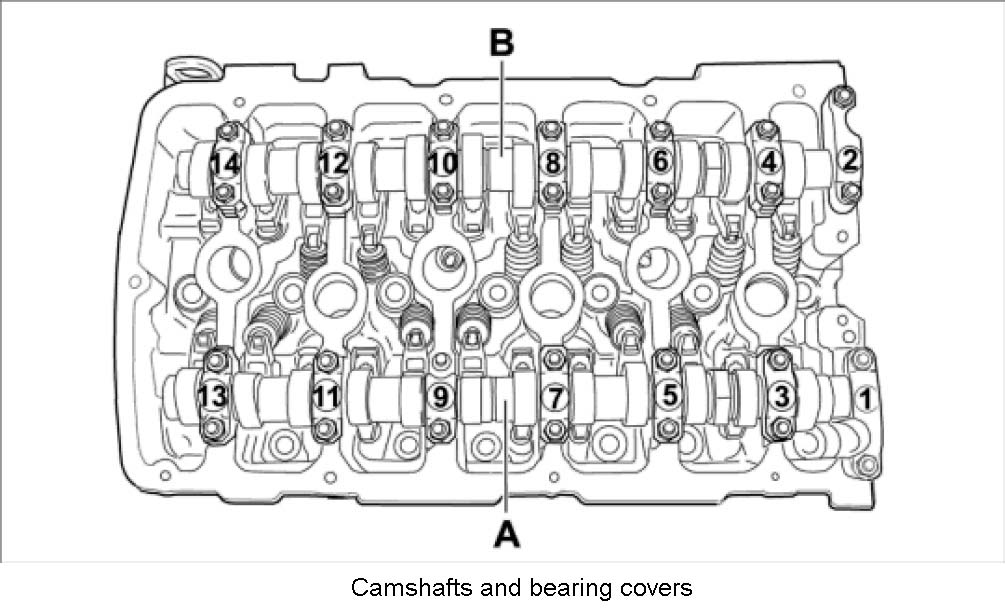 36. Unscrew camshaft bearing covers. Proceed step-by-step from the outside in. Mark the exact position of the bearing covers and place on a clean surface according to installation position.
