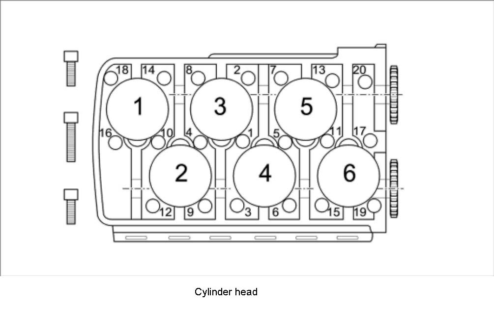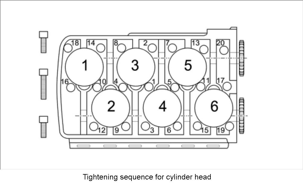 38. Unscrew cylinder head. Remove twenty internal-serration screws (thirteen M10 x 110 and seven M10 x 140) in reverse order to the sequence shown (middle screws are longer). Remove cylinder head with the help of an assistant and place it on a clean surface.