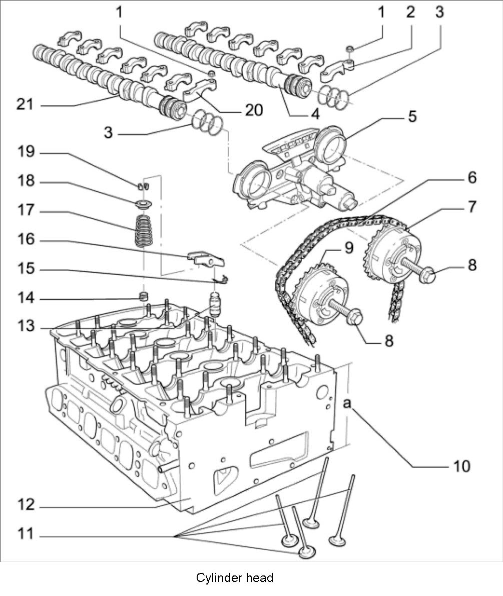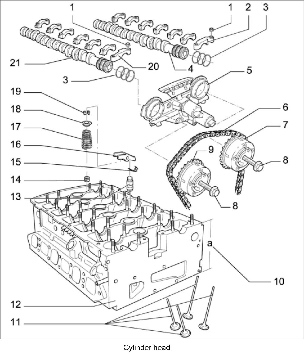 29. Loosen camshaft adjuster -4 and 22-. To do this, counter camshafts at the hexagon and loosen the fastening screws on the camshaft adjusters -23-.