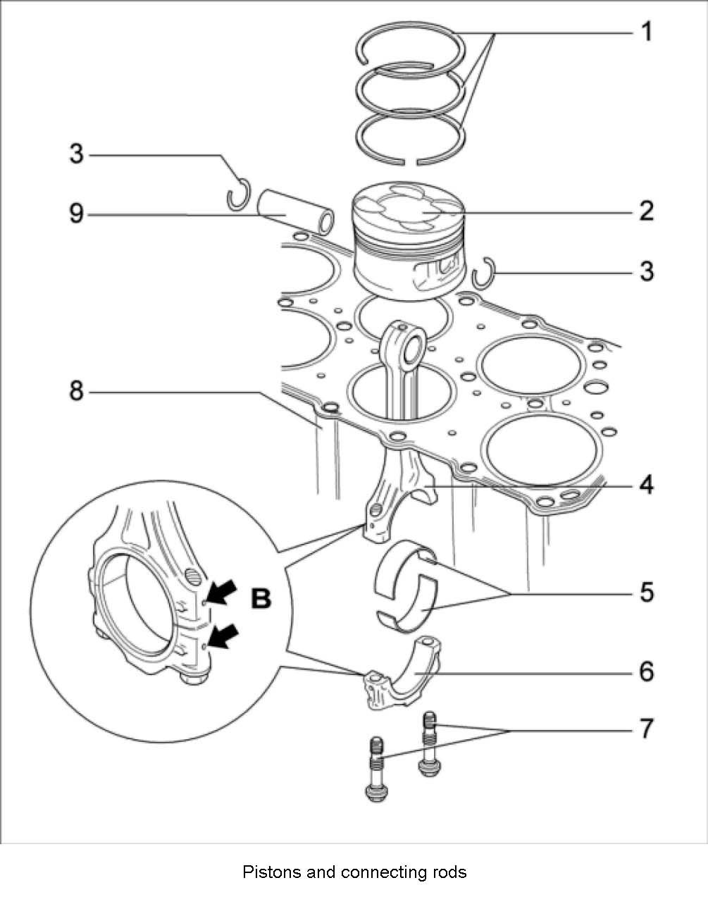 Note: The flat side of the piston crown always points to the middle of the cylinder block.