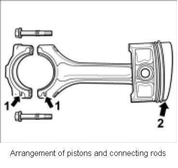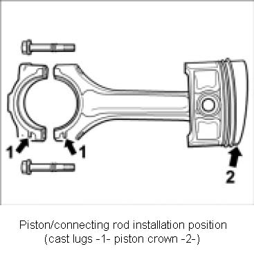 Note: Connecting-rod bearing caps must be marked and numbered during removal. Retaining lugs of bearing shells are pressed together. The cast lugs of connecting-rod bearings and connecting-rod big end are identical!