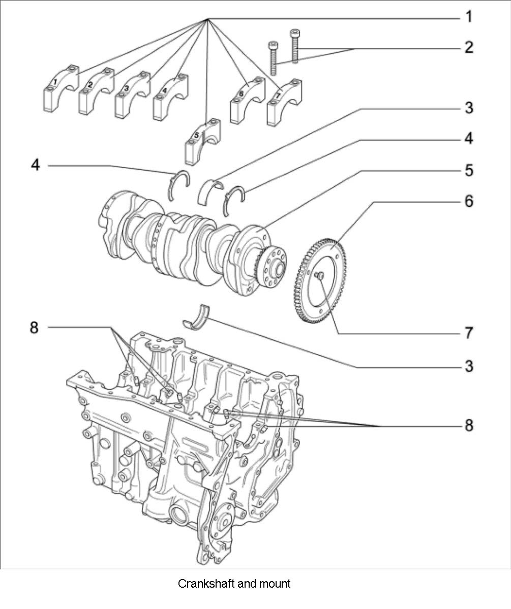 ^ Even numbers on bearing cap = outlet; uneven numbers on bearing cap = inlet; numbering sequence starting from timing chain side (output), legible from inlet side, housing edges pointed outward, no. 7 and 8 are thrust or guide bearings!