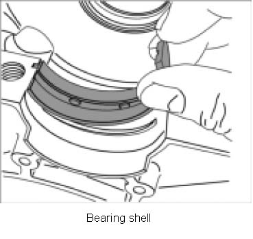 1. Replace crankshaft bearing shells (color markings must match). Insert and oil crankshaft bearing shells (on crankcase side). Make sure the twist lock is positioned in the corresponding cut-out Bearing shell.