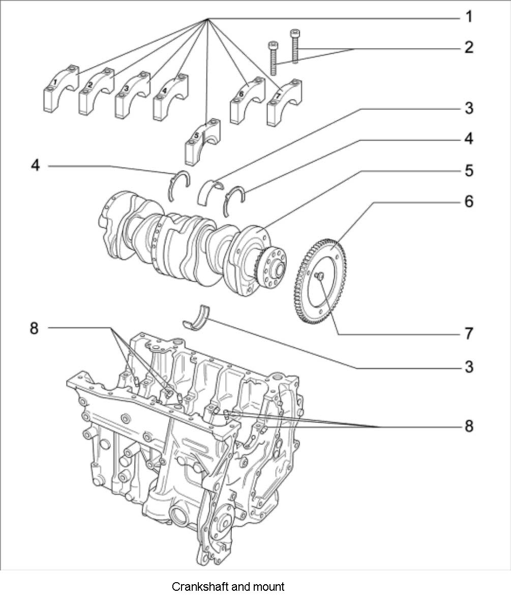 ^ Bearing covers for the crankshaft are numbered 1 to 7 and the numbers can be read on the side facing the exhaust.