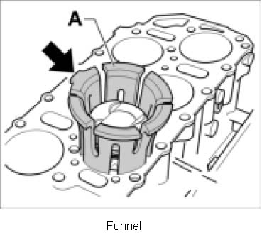 7. Insert oiled pistons and connecting rods using a funnel T10147. Turn the crankshaft back and forth as required so that there is sufficient room for installation. Align flat side of piston crown to the middle of the cylinder block. Always align the pins -arrow- on the funnel T10147 to the middle of the cylinder block.
