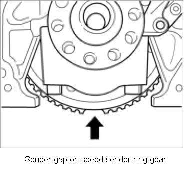 11. Turn the crankshaft so that the sender gap on the speed sender ring gear is pointing downwards to the middle (rough TDC presetting).