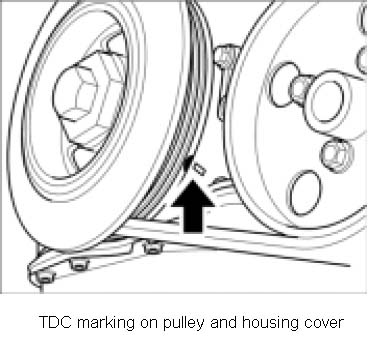 18. Turn engine to the ignition TDC of cylinder 1. To do this, turn the crankshaft so that the notch on the pulley is aligned with the marking on the housing cover.