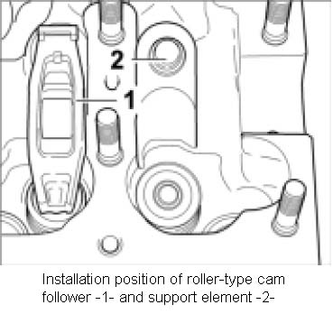 21. Oil the components. Install support element/roller-type cam follower. Make sure that the safety clip does not slip out of place during installation. The pressure face of the roller-type cam follower -3- must rest on the valve pressure face. This can slip out of place when the camshaft is installed later.