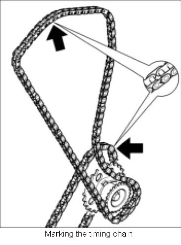^ Before removal, mark the timing chain rolling direction and timing chains with a colored pen. Retain timing chain rolling direction and timing chains during re-installation. Never use a prick punch or file for marking.