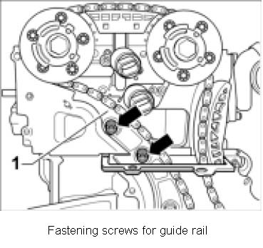 5. Remove timing chain between intermediate shaft and camshafts. To do this, remove black guide rail -1- by loosening the two M8 x 43 fastening screws -arrows- and remove timing chain up to camshaft.